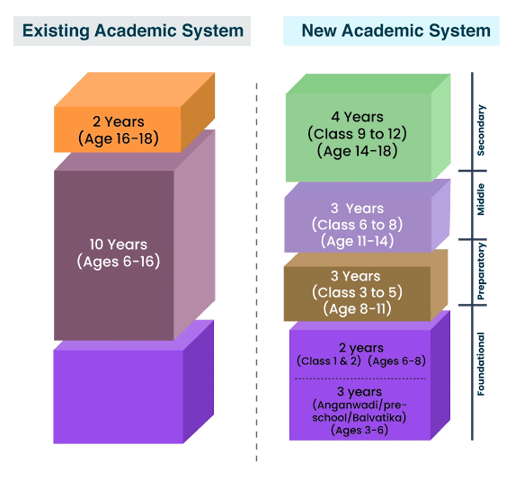 The NEP 2020 proposes the restructuring of school education into a 5+3+3+4 system, where the foundational stage includes ages 3 to 8 years, the preparatory stage includes ages 8 to 11 years, the middle stage includes ages 11 to 14 years, and the secondary stage includes ages 14 to 18 years.